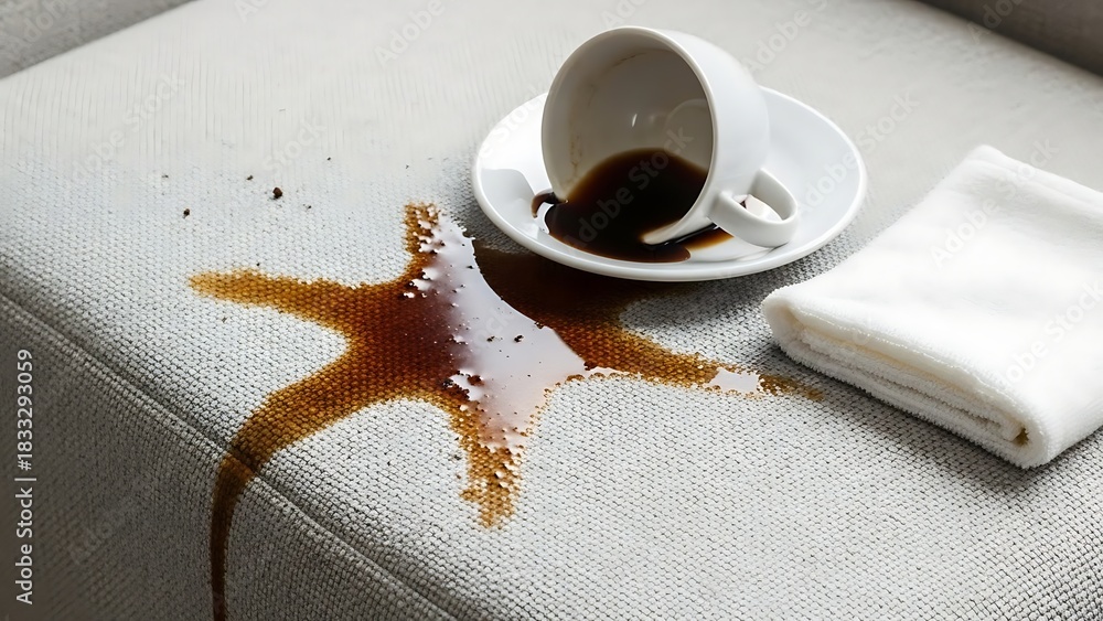 • Spilled Coffee Cup on Sofa Creating a Starburst Stain.
