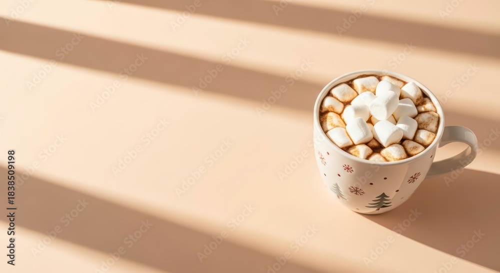 • Flat lay composition featuring a tin cup with marshmallows and hot cocoa, set in warm sunlight with shadows (मार्शमैलो)