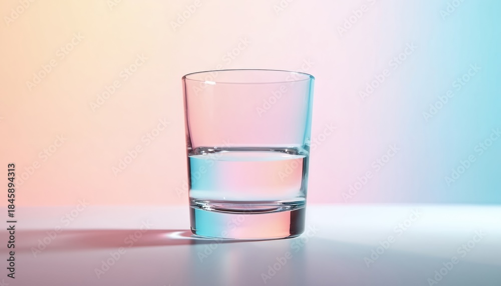 • Clear glass half full with water sits on white surface. Soft pastel gradient background of pink and blue hues. Minimalist still life studio photo.