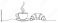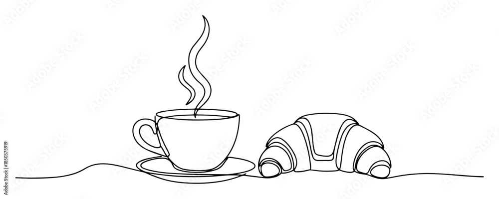 • Continuous line drawing of a steaming coffee cup and a croissant