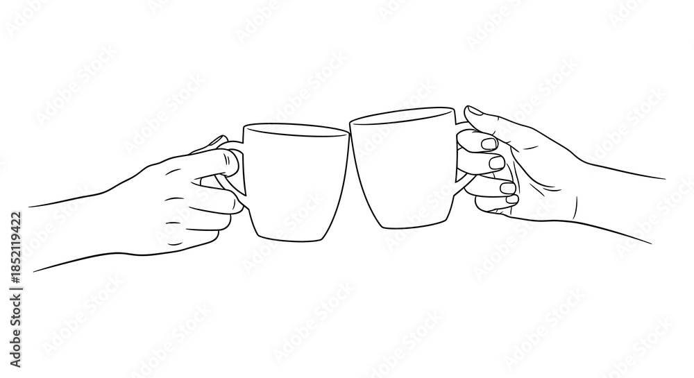 • Two hands holding coffee cups in a minimalist line art style silhouette