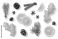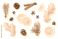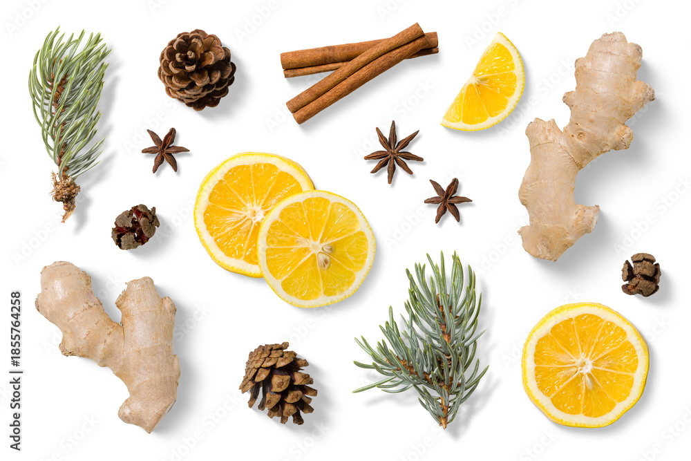 • Collection of natural winter elements with fresh ginger root, sliced lemon, cinnamon, star anise, pine branches and pine cones isolated on a transparent background. PNG ideal for food design.