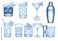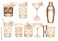 • detailed collection of vintage cocktails and bar tools (shaker, rocks glass) in intricate black ink line art illustration with cross-hatching, isolated on white. concept for classic beverage