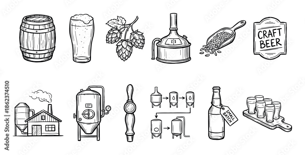 Plakat do Restauracji - Craft beer brewing process icon set featuring hand-drawn sketch illustrations of a brewery,... #1862374510