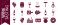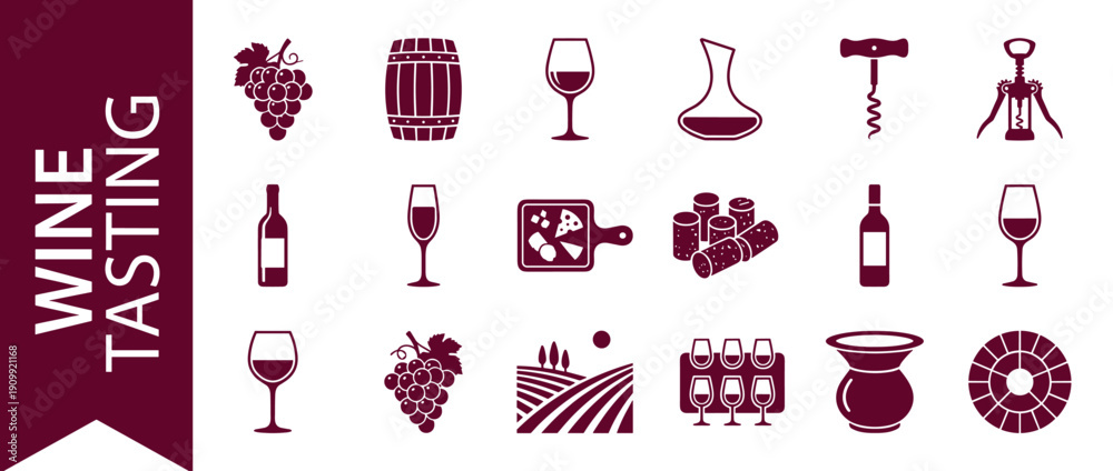 • Comprehensive wine tasting icon collection with grapes, barrels, glasses, decanters, and corkscrews. Elegant burgundy flat vector graphics for winery, sommelier, vineyard, and wine tasting events.