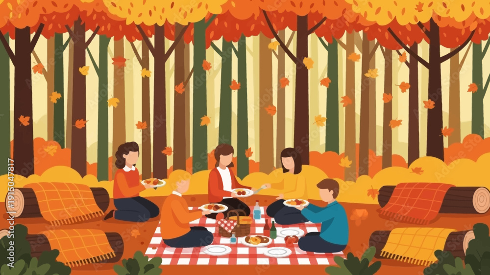 • Friends enjoying a delightful autumn picnic in a vibrant forest setting.