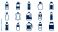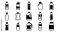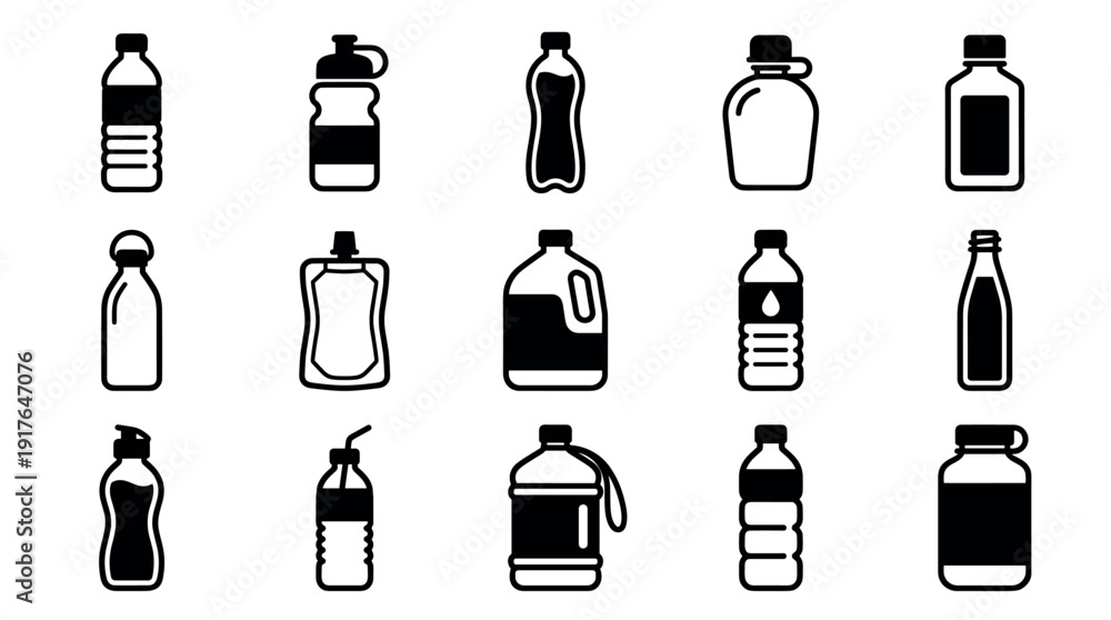 • Collection of black and white bottle icons showing various types of containers for water and other beverages in a simple, minimalist and modern graphic vector illustration set