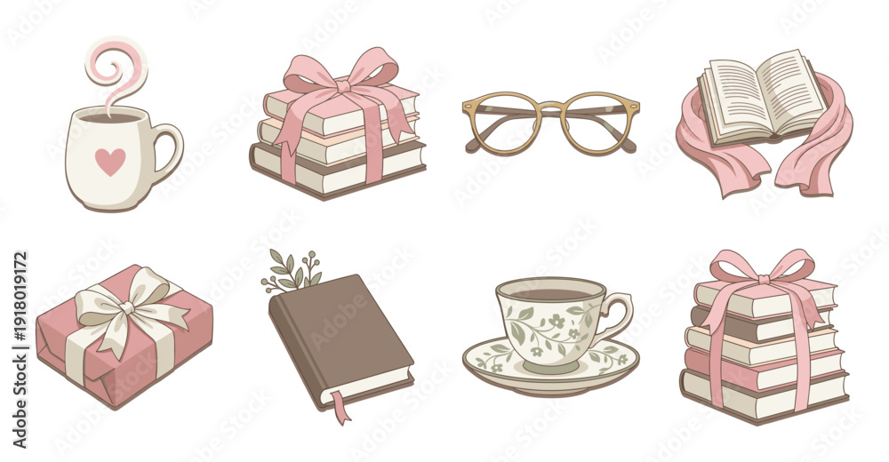 Plakat do Restauracji - Cozy Aesthetic Reading and Tea Sticker Set Vector #1918019172