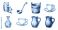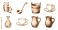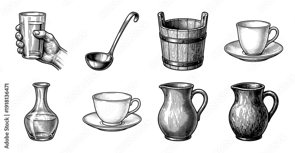 • Vintage engraving style collection of liquid containers including wood bucket pitchers carafes and tea cups