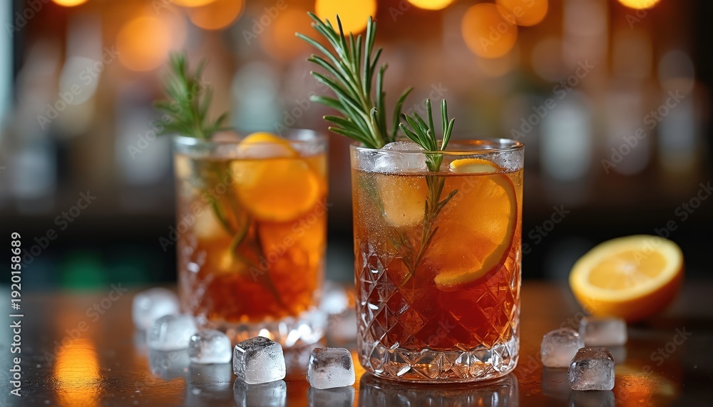 Plakat do Restauracji - Two chilled Cuba Libre cocktails with ice citrus and rosemary garnishes sit on a bar. Refreshing... #1920158689