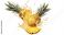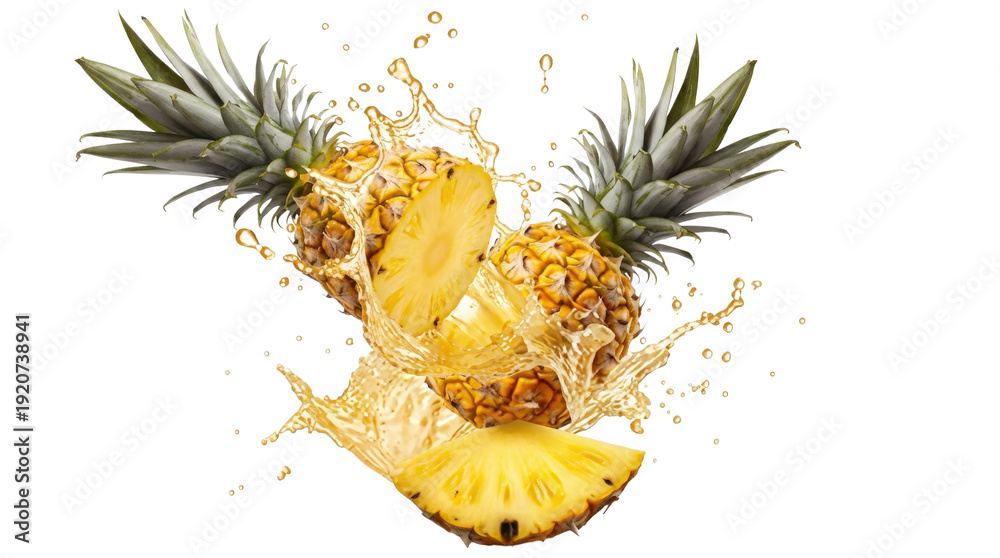 • Fresh pineapple pieces with splash of vibrant yellow juice against transparent background