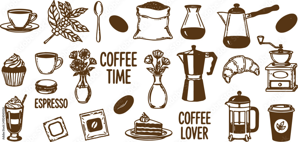 Plakat do Restauracji - coffee time and coffee lover icons set with various objects #1924043036