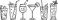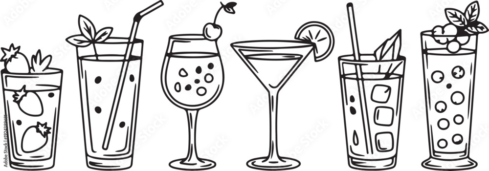• Row of diverse hand drawn black and white cocktail glasses with refreshing drinks and garnishes
