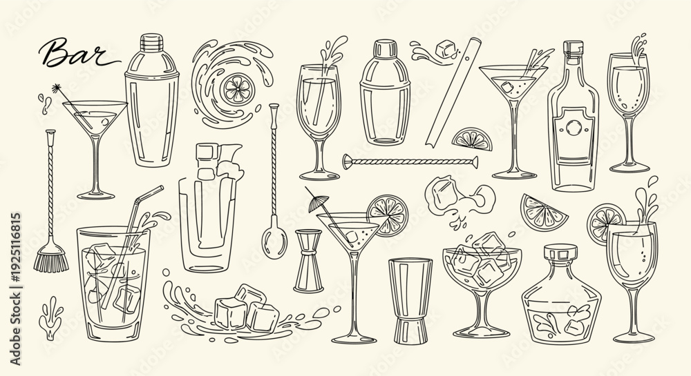 • Vintage Hand Drawn Bar Collection Featuring Cocktails Shakers Glasses Bottles And Barware Elements On A Light Background