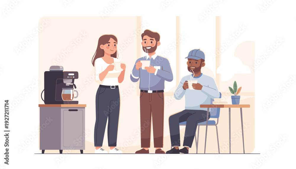 • Diverse Office Colleagues Enjoying a Coffee Break Together in a Modern Workspace; Happy Coworkers Socializing, Holding Mugs, and Relaxing Near a Coffee Machine in a Flat Vector Illustration.