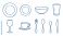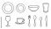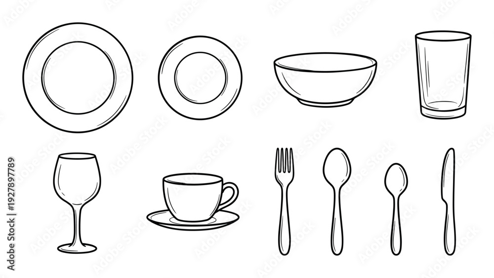 • Set of black and white tableware illustrations including plates, a bowl, glasses, a cup, and cutlery like a fork, spoons, and a knife, all in a simple hand-drawn line art style