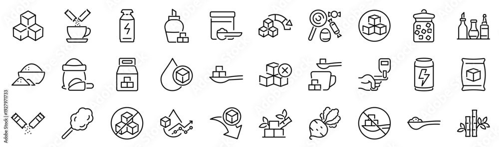 • Set of 30 outline icons related to sugar. Linear icon collection. Editable stroke. Vector illustration