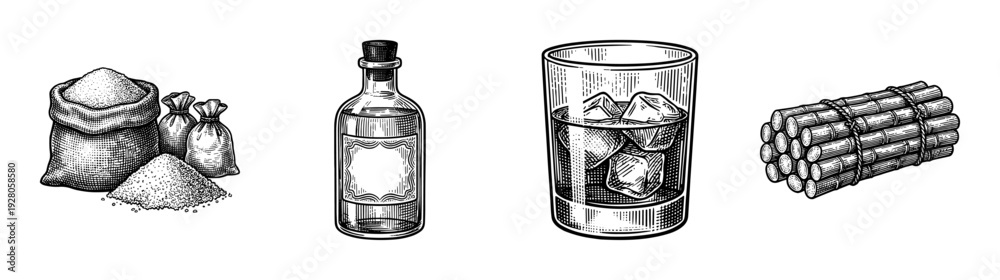 • Vintage engraving style collection of sugarcane products including sugar bags, glass of rum with ice cubes, liquor bottle, and harvested cane stalks.