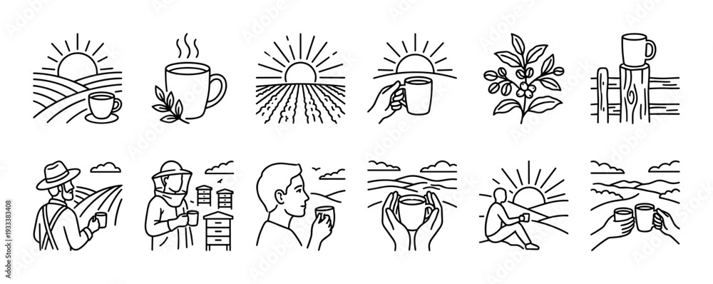 • Collection of minimalist coffee themed line icons featuring rural farm landscapes, sunrise scenes, farmers, and hot beverage mugs in a simple black and white outline style isolated on white