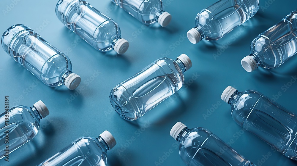 • Multiple plastic water bottles are scattered on a blue background, World Water Day