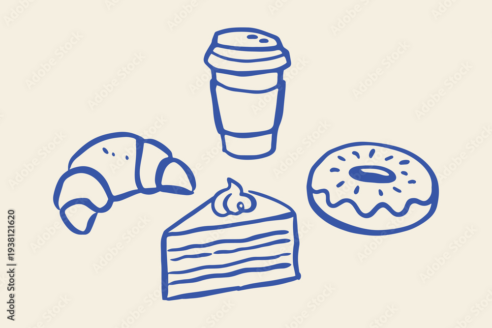 Plakat do Restauracji - Coffee and pastry set naive outline sketch vector illustration #1938121620