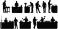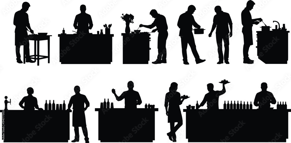 • Chef and bartender silhouettes cooking mixing drinks and preparing food at kitchen and bar counters