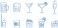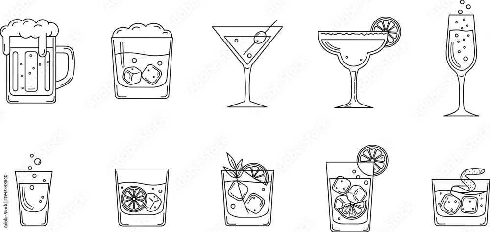 • Cocktail and alcohol drink line icon set with beer martini margarita whiskey glass citrus garnish bar beverage illustration