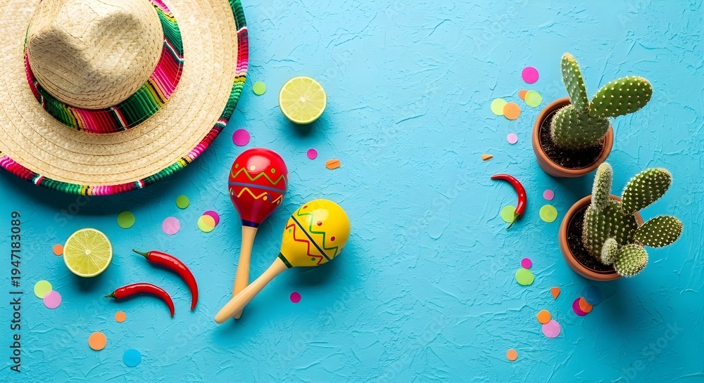 • Vibrant fiesta scene with sombrero maracas and cactus on blue background