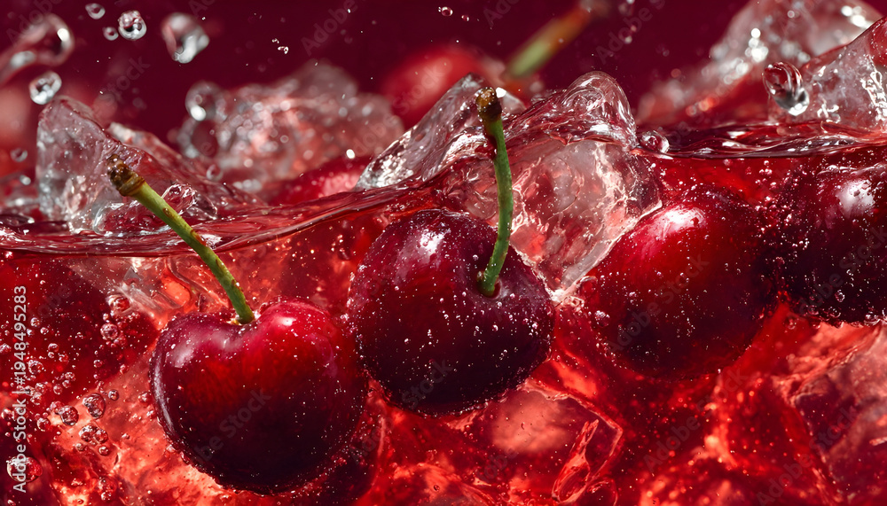 • Close-up cherries with ice in vibrant red liquid motion, perfect for soda, juice, and syrup marketing