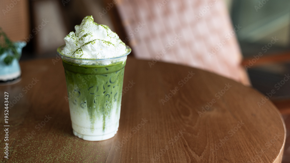 Plakat do Restauracji - Iced matcha latte layered with milk and topped with crunchy brown sugar waffle pieces #1952443427