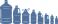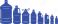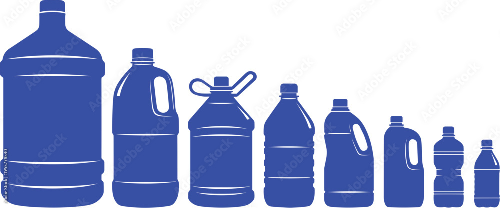 • Plastic bottle vector silhouette set with various container sizes, water and beverage packaging shapes collection isolated on white background.