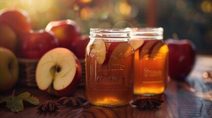 Plakat Golden liquid honey in a clear glass jar with a decorative label and golden lid on a wooden surfaceDopasuj i kup