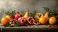 • kompozycja martwa natura, owoce zimowe, granaty, pomarańcze, gruszki, rustykalny stół, kawałki owoców, liście, świeży tymianek, delikatne oświetlenie boczne, naturalne tekstury, intensywne kolory, tło