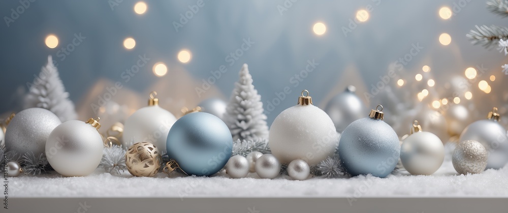 Plakat do Salonu - Świąteczna aranżacja srebrnych i złotych bombek z małymi białymi choinkami na tle śnieżnego tła z... #1138704867