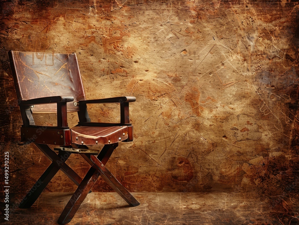 Plakat do Salonu - Stare, drewniane krzesło reżyserskie na tle tekstury #1499270225