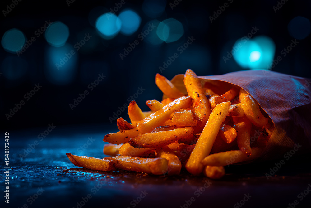 • Duża porcja złocistych frytek w papierowej torebce, leżąca na ciemnej powierzchni z rozmyciem tła. Fast food w nocnym otoczeniu.