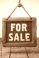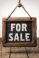 • Drewniana, rustykalna tabliczka z napisem "FOR SALE" wisi na sznurku, na tle desek i białego tła, co sugeruje sprzedaż nieruchomości lub przedmiotów.