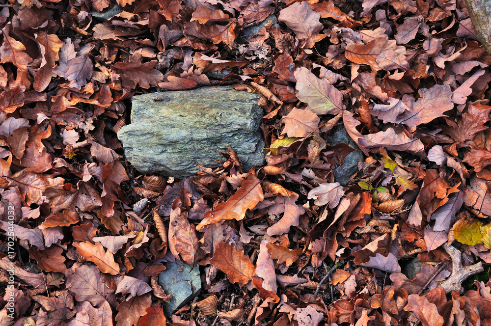 Plakat do Salonu - Rezerwat Przyrody "Nad Groblą" (Park Krajobrazowy "Chełmy").Kamień wśród jesiennych liści... #1702544032