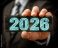 • Zbliżenie na dłoń w garniturze trzymającą tabliczkę z wygrawerowanym i podświetlonym turkusowym światłem napisem „2026” na tle ciemnego tła.