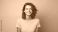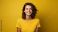• Portret studyjny młodej kobiety uśmiechniętej na żółtym tle z dużą ilością wolnego tła
