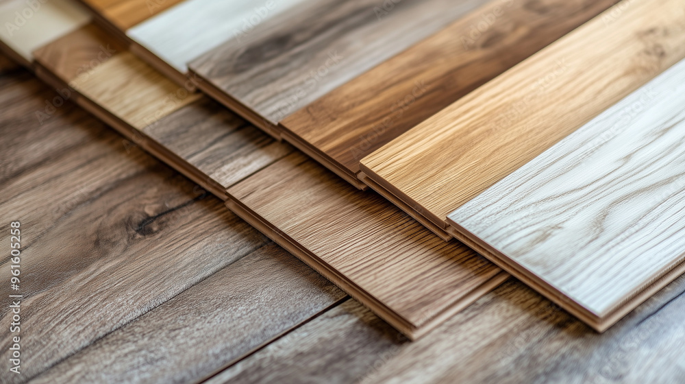 Plakat do Salonu - Próbki kwadratowych paneli podłogowych z laminatu i winylu, ułożone na tle dębowego drewna. #961605258