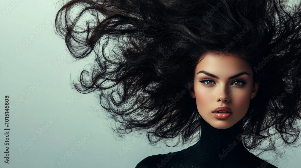 • Modelka o olśniewającej urodzie prezentuje się w wyrazistej stylizacji, w której jej ogromne, bujne włosy przyciągają wszystkie spojrzenia.