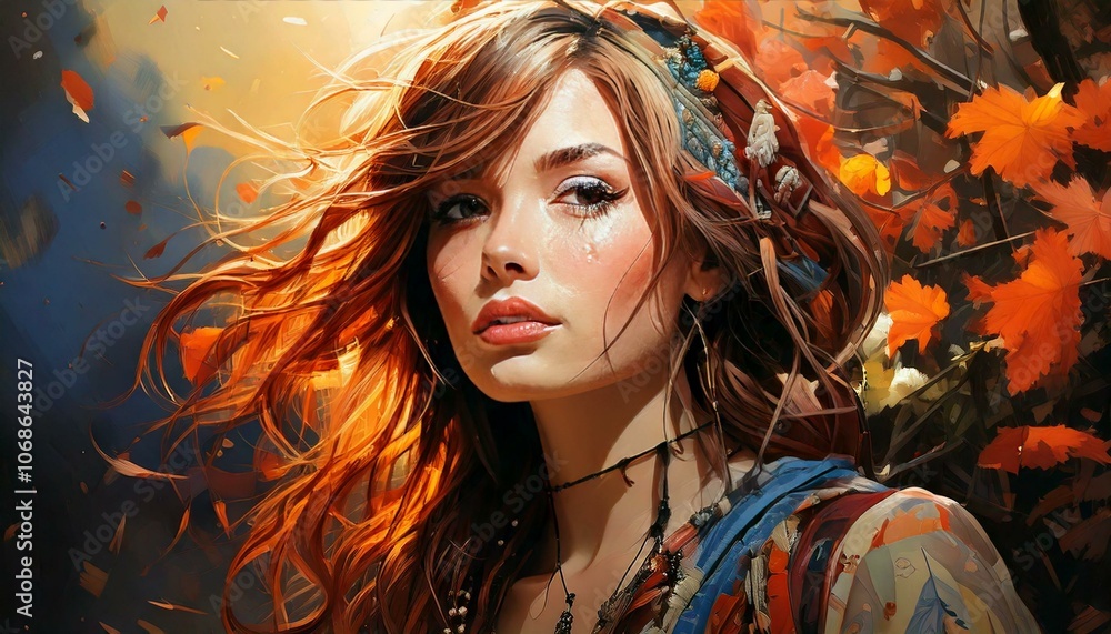 • Jesienny portret młodej dziewczyny, nastolatki, z potarganymi przez wiatr włosami. Rysunek, ilustracja.