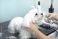 • Salon urody dla zwierząt. Kobiece ręce czeszą sierść grzebieniem rasy maltańczyk.