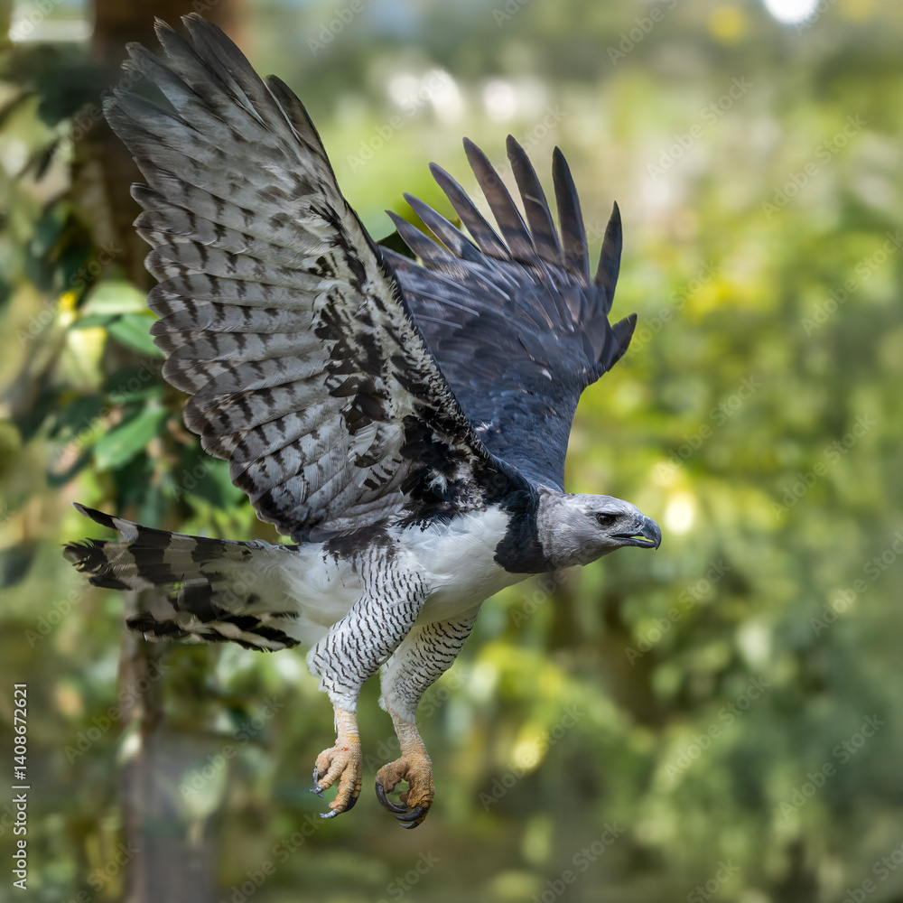 • A majestic Harpy Eagle (Harpia harpyja) captured mid-flight with wings fully spread. Native to Central and South America, the Harpy Eagle is one of the largest and most formidable birds of prey.