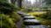 • Tranquil garden pathway with mossy stones leading to a peaceful pond in a lush green, serene setting.