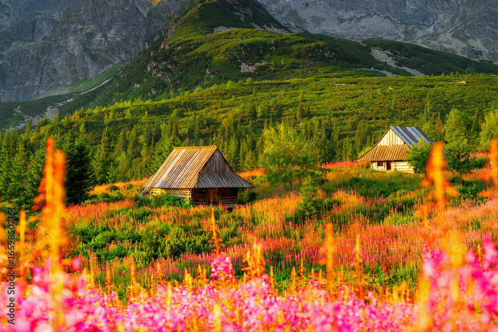 • The picturesque Gąsienicowa Valley in the Tatra Mountains with mountain huts at sunrise, the most beautiful place in Poland, a Tatra valley full of flowers.