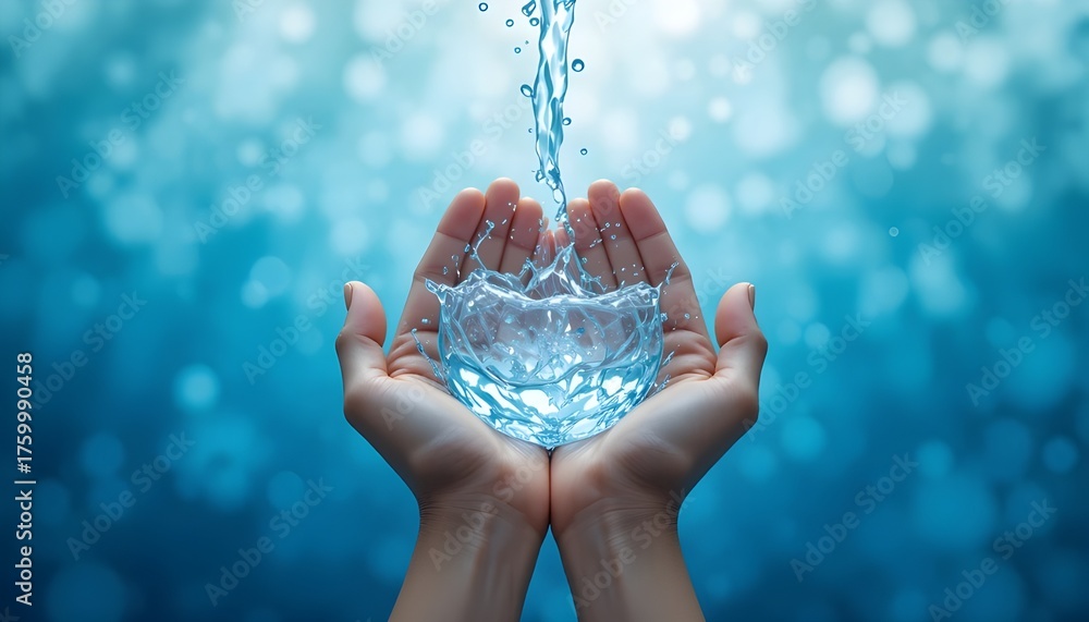 • Hands Holding Flowing Water — A Symbol of Life, Purity, and Sustainability, Capturing the Essence of Clean Water Conservation and the Beauty of Nature’s Most Precious Resource in Soft Blue Light
