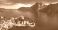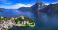 • Salzkammergut, Austria tourism. Austrian most beautiful lakes - Traunsee, aerial view of scenic village peninsola Traunkirchen . aerial drone panoramic view