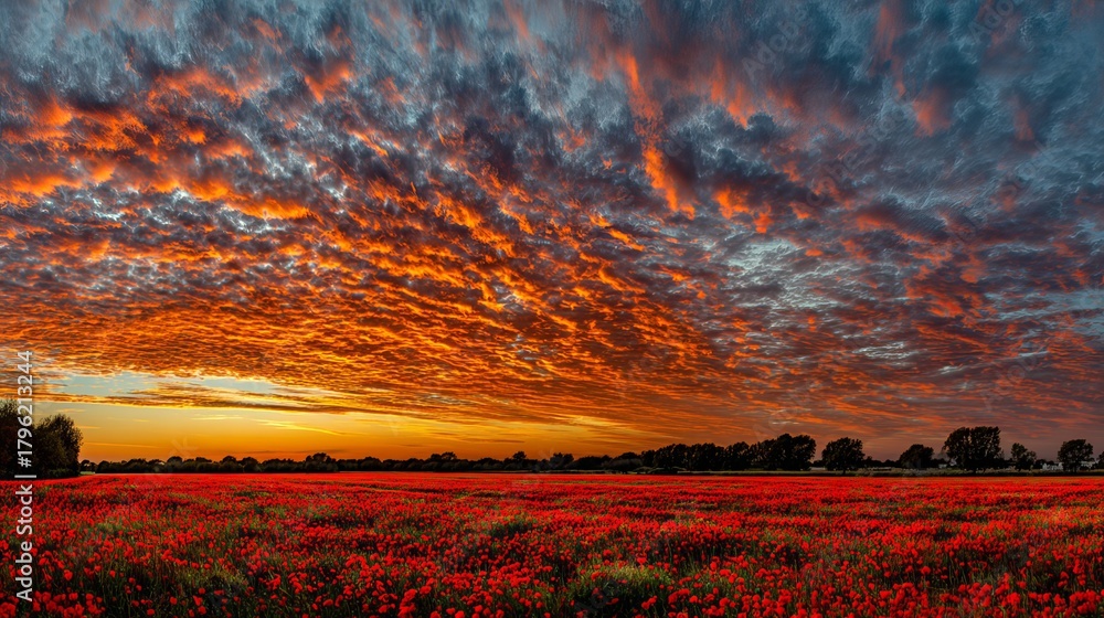 • A stunning sunset over a red poppy field in the English countryside, casting long shadows and creating a vibrant, enchanting atmosphere that captures nature’s beauty at its most captivating moment.